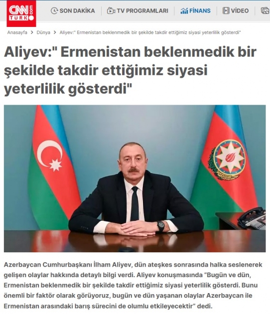 Türkiyə KİV-ləri Prezident İlham Əliyevin müraciətində Qarabağın erməni sakinlərinə mesajlarına da xüsusi yer veriblər. Dövlətimizin başçısının Azərbaycan dövləti və xalqının bütün haqsızlıqlara, kriminal Ermənistan rejimi tərəfindən törədilmiş bütün cinayətlərə baxmayaraq, erməni xalqını bu cinayətlərdə heç vaxt günahlandırmadığını qeyd etməsi bildirilib.