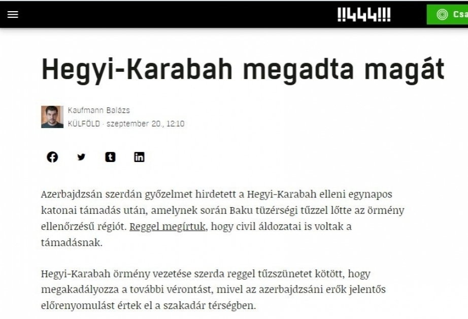 Macarıstanın kütləvi informasiya vasitələri Azərbaycanın Qarabağ bölgəsində 24 saat ərzində keçirilən lokal antiterror tədbirlərini geniş işıqlandırıb. Siyasi analitik Andraş Raçın “444.hu” nəşrində dərc olunmuş məqaləsində Bakıdakı mərkəzi hökuməti son nəticədə Azərbaycan ərazisindəki Ermənistan silahlı qüvvələrinin qalıqlarının zərərsizləşdirilməsi qərarına gətirib çıxaran hadisələrin xronologiyası yer alıb. Müəllif antiterror tədbirlərinin keçirildiyi zonanın “Ermənistanın nəzarəti altında” olduğunu və bu ərazidə rəsmi İrəvan tərəfindən idarə edilən qanunsuz hərbi birləşmələrin yerləşdiyini qeyd edib.