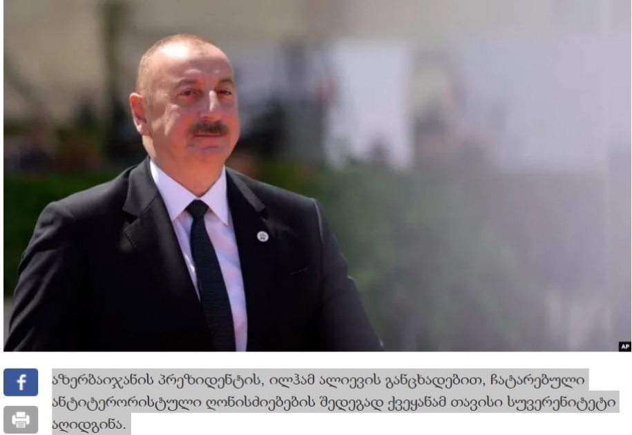Prezident İlham Əliyevin xalqa müraciəti və müraciəti zamanı söylədiyi fikirlər Gürcüstan mediasının diqqət mərkəzindədir. Bu ölkənin “interpressnews.ge”, “netgazeti.ge”, “frontnews.ge”, “newposts.ge”, “ghn.ge”, “apsny.ge”, “kavkasiya.com”, “qafqazturk.com”, “palitranews.ge”, “ambebi.ge”, “24news.ge”, “aktual.ge”, “interpress.ge”, “newsday.ge”, “realnews.ge”, informasiya portallarının, eləcə də “1tv.ge”, “maestro.tv”, “tv.pirveli”, “rustavi2” televiziya kanallarının yaydıqları xəbərlərdə oxuculara və tamaşaçılara Azərbaycan Prezidentinin fikirləri Azərbaycan, rus və gürcü dillərində məlumatlar çatdırılıb. Məlumatlarda Azərbaycan Prezidentinin Qarabağ iqtisadi rayonunda yaşayan ermənilərin bundan sonra dinc yaşayacaqları, regionun inkişafı, heç kimin Azərbaycanla ultimatum dilində danışa bilməyəcəyi, regionda yeni dövrün başlanacağı barədə fikirləri xüsusi qeyd olunub. Ümumilikdə Gürcüstan mətbuatında Azərbaycan Prezidentinin müraciəti ilə bağlı 50-dən çox xəbər yayımlanıb.