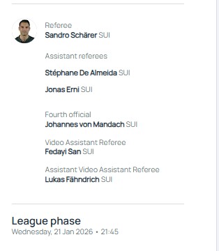 Baş hakimin köməkçiləri Stefan De Almeyda və Conas Erni olacaq. Yohannes von Mandaç dördüncü hakim funksiyasını yerinə yetirəcək. VAR hakimləri isə Fedayi San və Lukas Fandrix olacaq.