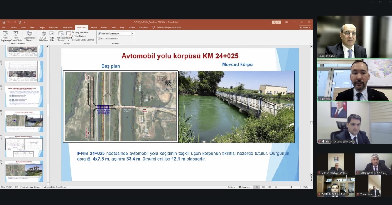 Daha sonra Dövlət Su Ehtiyatları Agentliyinin tabeliyində olan layihə institutu və layihəyə cəlb edilmiş PROYAPI və TEMELSU şirkətlərinin mütəxəssisləri tərəfindən birgə hazırlanmış layihə sənədlərinin cari vəziyyəti barədə təqdimat keçirilib. Təqdimatda Qarabağ suvarma kanalının 26 km-lik 1-ci hissəsinin layihə-smeta sənədlərinin yekunlaşmaq üzrə olduğu bildirilərək, Qarabağ, Mil və Muğan düzlərində aqrar-sənaye komplekslərinin inkişaf perspektivləri nəzərə alınmaqla layihənin mümkün variantlarının araşdırılmasının tamamlandığı vurğulanıb.
