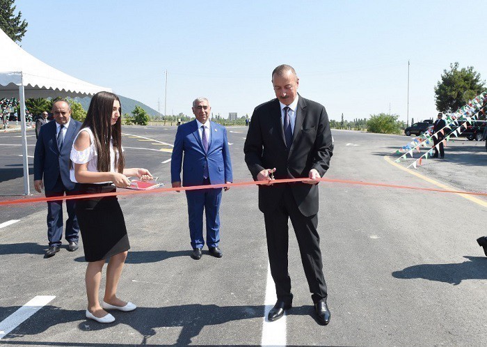 Prezident yolun rəmzi açılışını bildirən lenti kəsib.