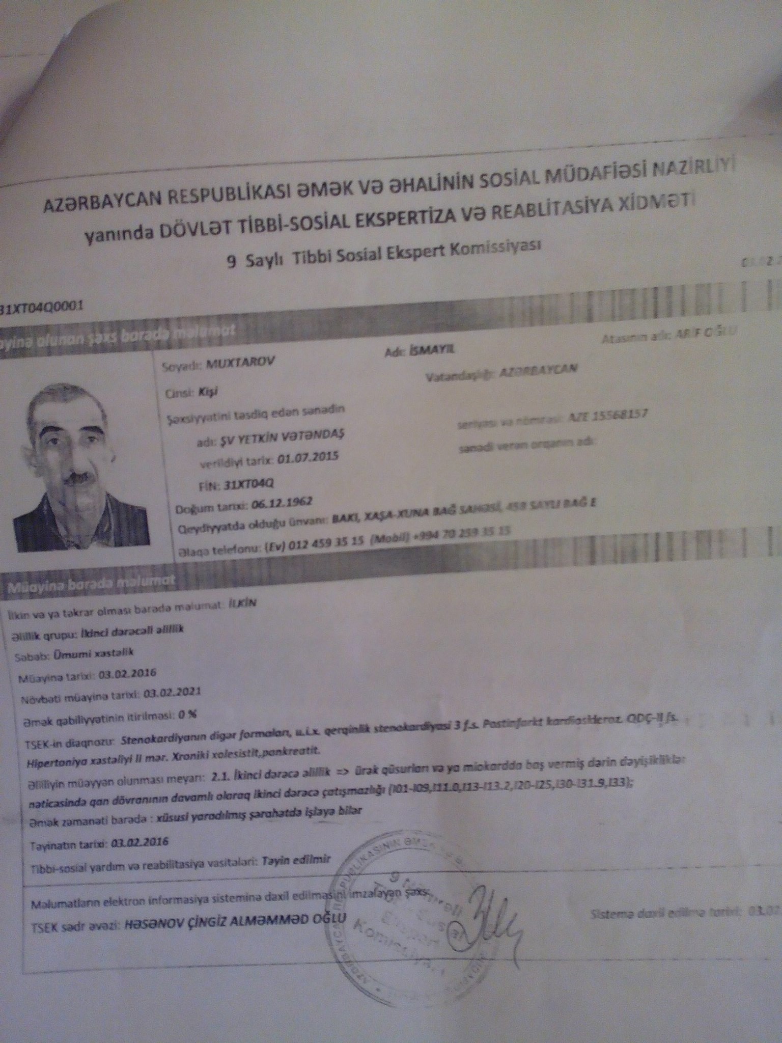 Bu barədə “Qafqazinfo”ya müraciət edən şikayətçi qeyd edib ki, 2015- ci ilin avqustunda şirkətdə qaynaq maşın operatorunda işləyən zaman infarkt keçirib: “İş sahəsinin həkiminin köməkliyi ilə xəstəxanaya çatdırıldım və 6 ay xəstə yatdım. Bundan sonra mənə 2-ci qrup əlil statusu verildi. Şirkət isə yalnız 650 manat pul verməklə kifayətləndi. Artıq bir ilə yaxındır ki, rəhbərlik istehsalatda əmək qabiliyyətimin itirilməsi ilə bağlı aktı mənə vermir. Bununla bağlı dəfələrlə Dövlət Əmək Müfəttişliyinə, Əmək və Əhalinin sosial Müdafiəsi Nazirliyinə müraciət etmişəm.