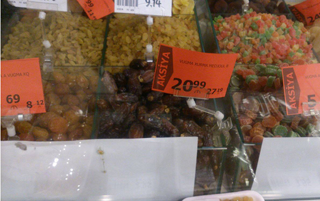 Supermarketlərin bəzilərində bayramla əlaqədar olaraq meyvə quruları endirimə düşdüyünün şahidi olduq. Belə ki, xurmanın qiyməti 27,19-dan 20,99 manata, 7,35-dən 4,99 manata düşüb. Ümumi olaraq isə çəki ilə satılan xurmaların qiyməti 20 manatla 5 manat, qutudakı xurmaların qiyməti isə 2,59 manatdan 5 manat arasında dəyişir. Ancaq tanınmış çərəz marketlərində bu qiymətlər bir az daha bahadır.