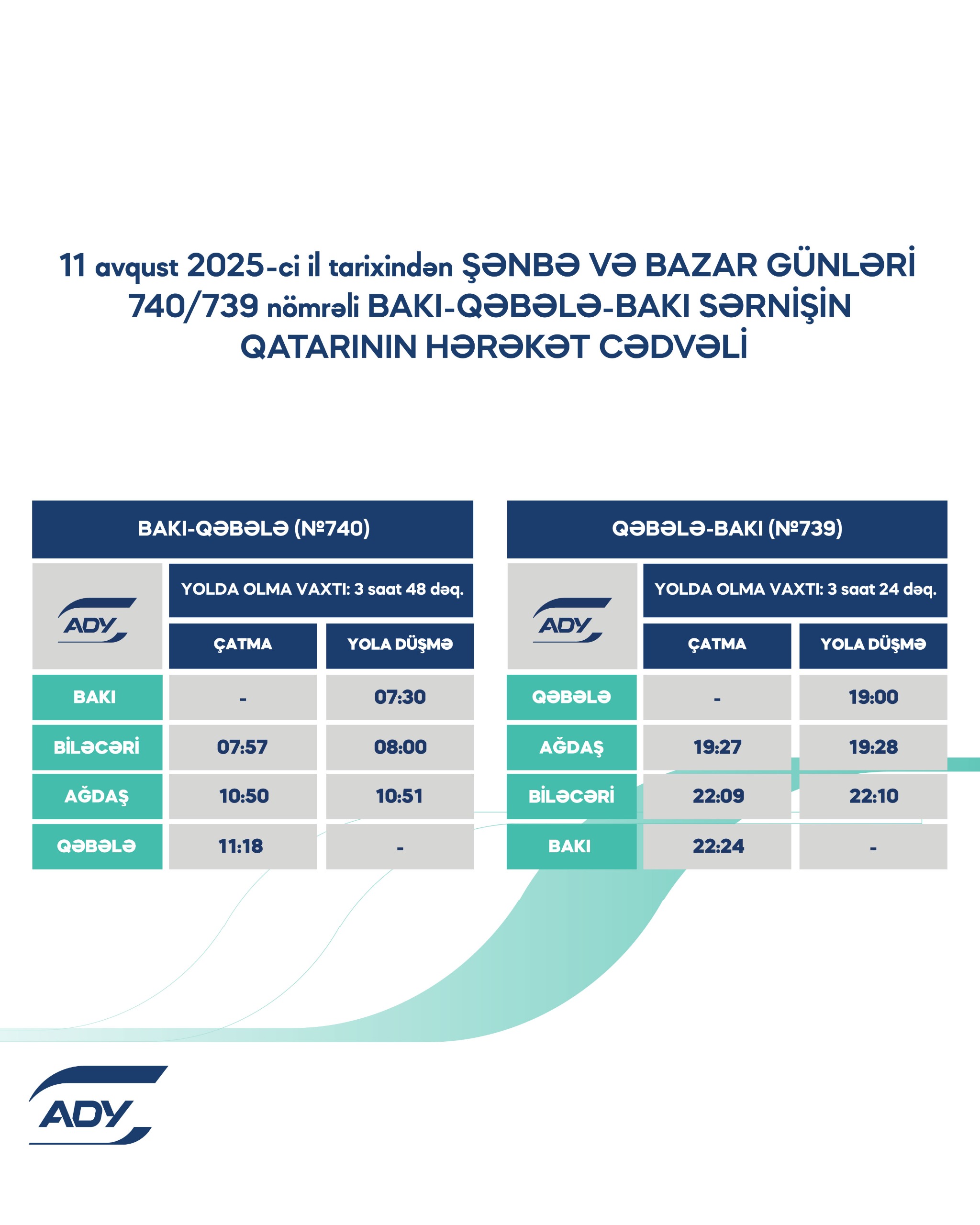 Bildirilib ki, Bakı–Keşlə sahəsində aparılan təmir işləri ilə əlaqədar olaraq, avqustun 11-dən etibarən Bakı-Balakən-Bakı, Bakı-Qəbələ-Bakı və Bakı-Qazax-Bakı marşrutu üzrə sərnişin qatarları yenilənmiş hərəkət cədvəli ilə xidmət göstərir.