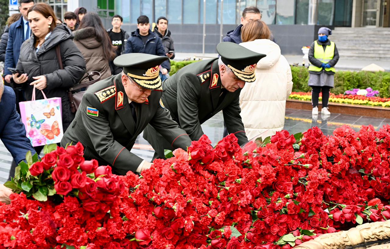 Rəsmilər Xocalı soyqırımı abidəsi önünə gül dəstələri düzüblər.