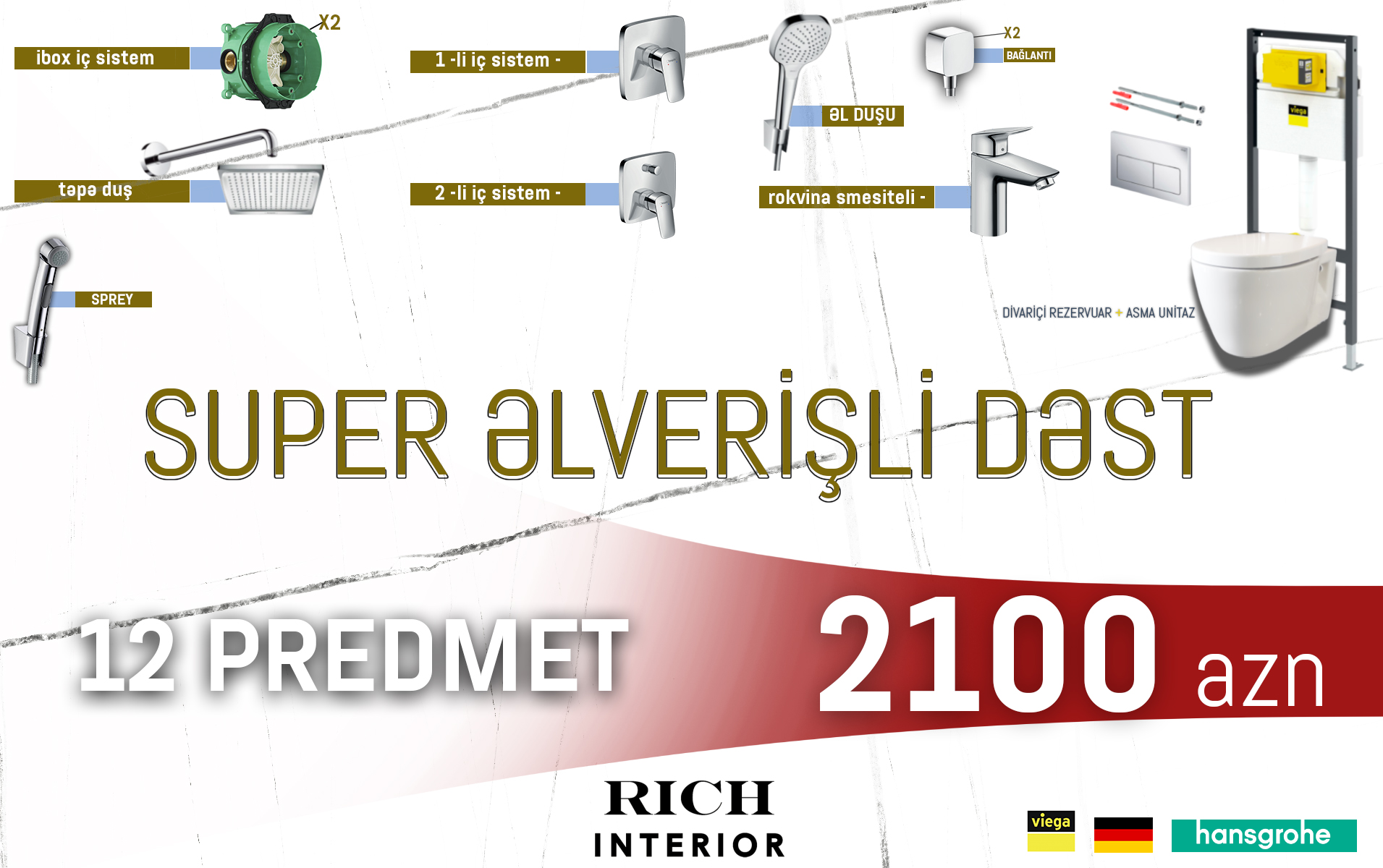 "Qafqazinfo" xəbər verir ki, şirkət hamam otağınıza lazım olan 12 predmetdən ibarət İtaliya və Almaniya istehsalı santexnika dəstini cəmi 1900 azn ilə əldə etmək imkanı yaradıb.