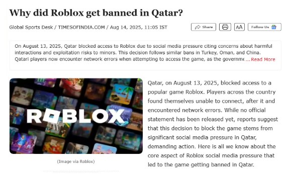 2026-cı ilin yanvar ayından etibarən “Roblox” Əlcəzair, Çin, İraq, Oman, Qətər, Rusiya və Türkiyədə bloklanıb və ya məhdudlaşdırılıb.
