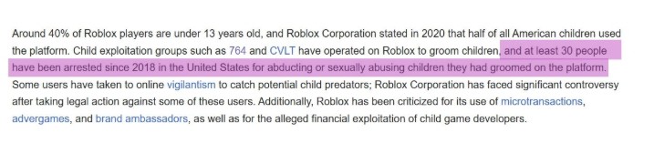 2018-ci ildən bəri ABŞ-də “Roblox” vasitəsilə tanış olduqları uşaqları qaçırdıqları və ya cinsi təcavüz etdikləri üçün ən azı 24 nəfərin, 2025-ci ilin iyun ayına qədər daha altı nəfərin həbs olunduğu mediada bildirilib.