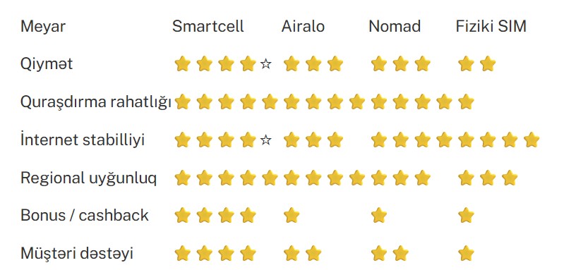 Qiymətlər oxşar görünə bilər, amma “Smartcell”in verdiyi əlavə dəyər (bonuslar, lokallaşdırma, stabil şəbəkə) uzunmüddətli istifadə üçün fərq yaradır. Bu nöqtədə “Smartcell” maraqlı alternativ kimi ortaya çıxır.