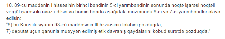 Bildiyiniz kimi, sentyabr 26-da Konstitusiyaya dəyişikliklər edilməsi ilə bağlı keçirilmiş referendumda Konstitusiyanın 89-cu maddəsinə 6 və 7-ci bəndlər əlavə olunub. Əlavə edilmiş 7-ci bəndin mahiyyəti odur ki, deputat üçün qanunla müəyyən edilmiş etik davranış qaydalarını kobud surətdə pozduqda Azərbaycan Respublikası Milli Məclisinin deputatlığından məhrumetmə haqqında qərar qanunla müəyyən edilmiş qaydada qəbul edilir.