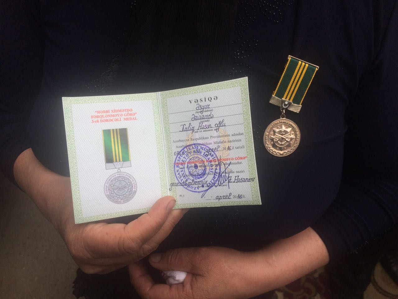 Daha sonra İcra başçısı Müdafiə Nazirinin əmri ilə təltif edildiyi “Hərbi Xidmətdə Fərqlənməyə görə” medalını Xaliq Əzzizadənin valideynlərinə təqdim edib.