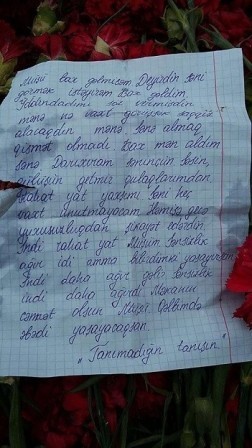 "Qafqazinfo" Axar.az-a istinadən xəbər verir ki, şəhid məzarını ziyarət edən insanlar qəbir üstə tər güllər, onun yanında isə saqqız və məktub görüblər. Heç kəsin tanımadığı gənc qızın yazdığı və qəbir üstə qoyduğu məktub ziyarətə gələnləri duyğulandırıb.