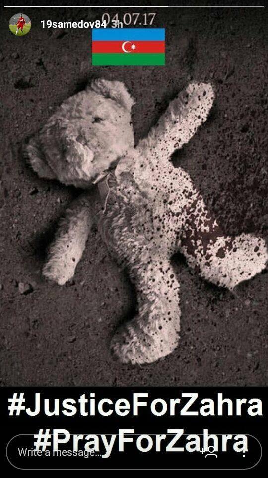 “Qafqazinfo”nun məlumatına görə, o, instaqram hesabında üzərində “Zəhra üçün ədalət”, “Zəhra üçün dua et” sözləri yazılmış foto paylaşıb.
