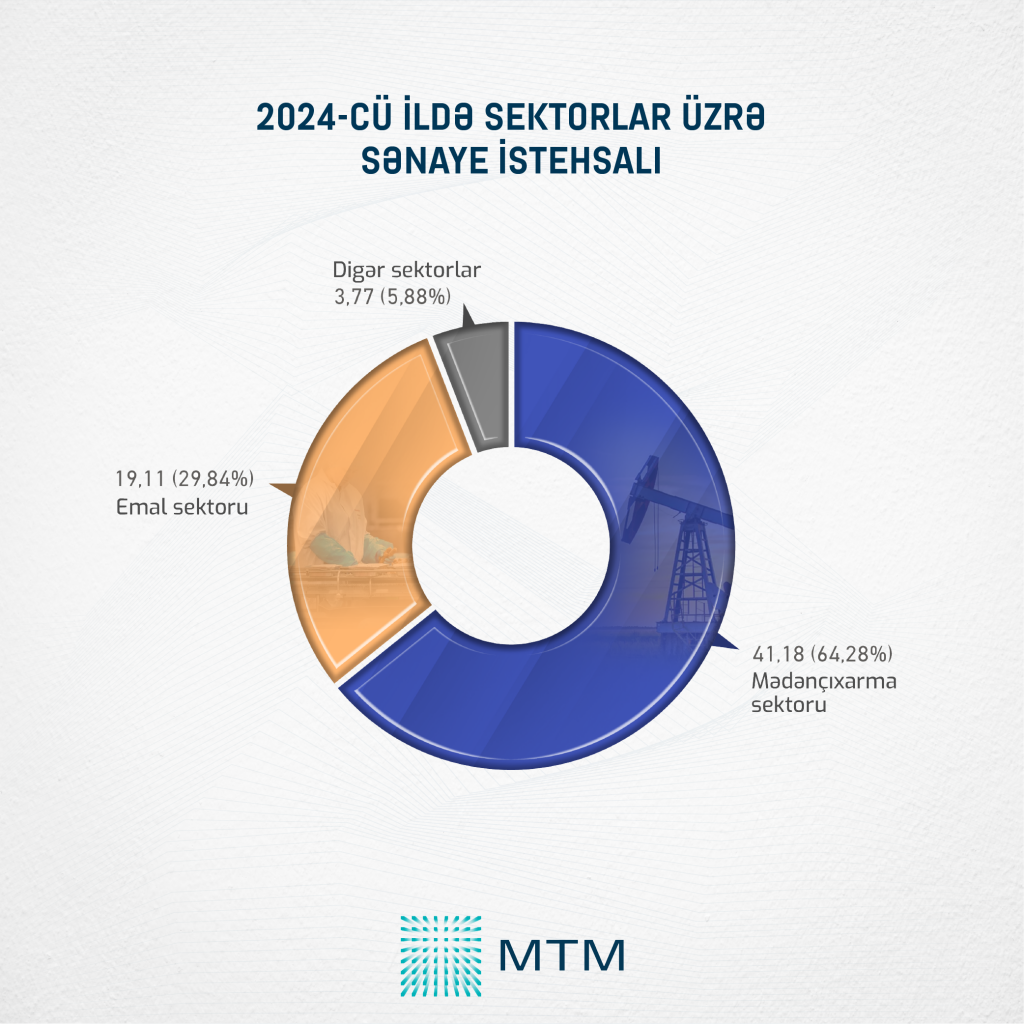 2024-cü ildə mədənçıxarma sektoru üzrə istehsal həcmi 41,18 milyard manat olub və ümumi sənaye istehsalının 64,28%-ni təşkil edib. Emal sektoru ümumi sənaye istehsalının 29,84%-ni təşkil edib. İl ərzində bu sektor üzrə 19,11 milyard manat həcmində istehsal qeydə alınıb. Digər sektorlar üzrə isə sənaye istehsalı cəmi 3,77 milyard manat təşkil edib. Bu, ümumi istehsalın 5,88% nə bərabərdir. Digər sektorlar dedikdə elektrik enerjisi, qaz və buxar istehsalı, bölüşdürülməsi və təchizatı, həmçinin su təchizatı: tullantıların təmizlənməsi və emalı nəzərdə tutulur. Əlavə olaraq bildirək ki, son 5 ilin hər birində digər kateqoriya üzrə sənaye istehsalı 7%-dən az olub.