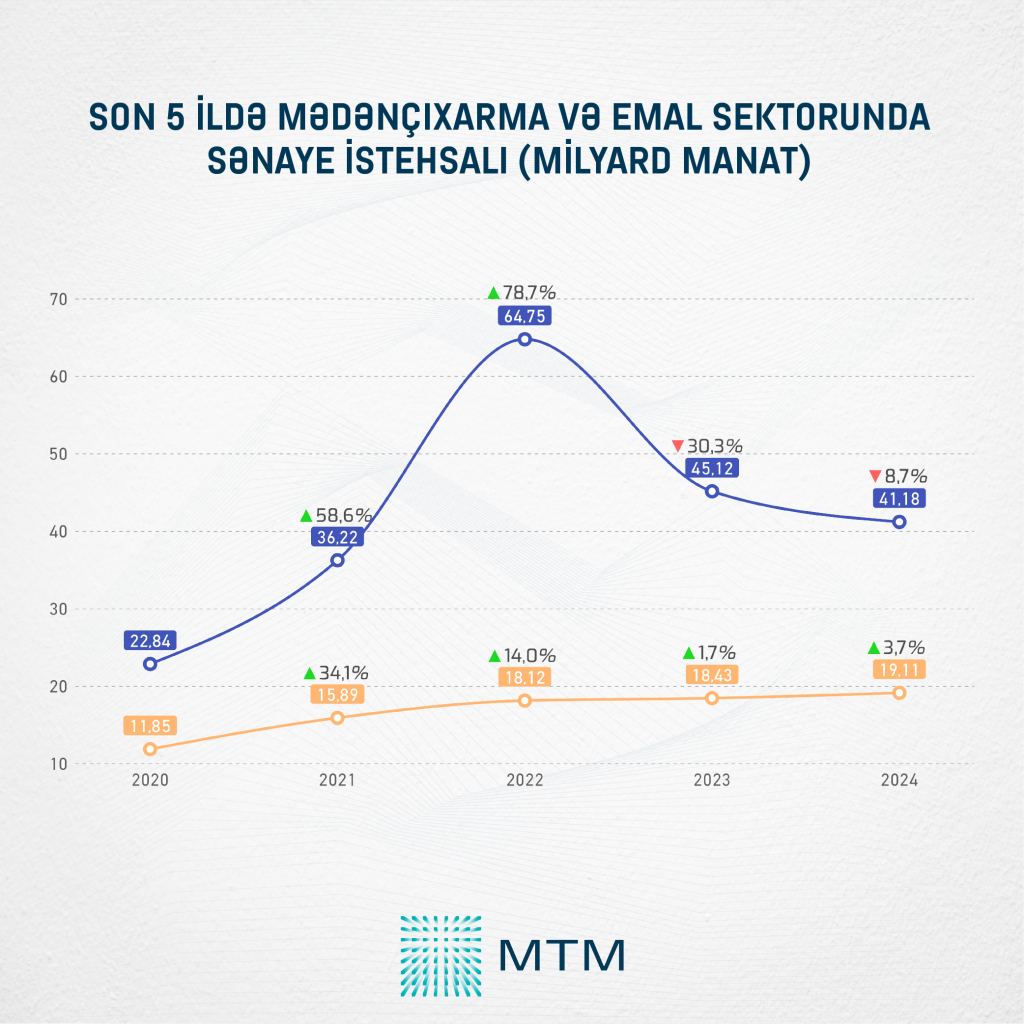 Mədənçıxarma sektoru və emal sektoru üzrə son 5 ildə qeydə alınan sənaye istehsalı həcminə baxsaq, mədənçıxarma sektorunun sənaye istehsalının həcminə necə təsir etdiyini daha dəqiq görə bilərik. 2024-cü ildə mədənçıxarma sektoru üzrə sənaye istehsalı əvvəlki il ilə müqayisədə 8,7% və ya 3,94 milyard manat azalaraq 41,18 milyard manata bərabər olub. Ən yüksək istehsal isə 2022-ci ildə (64,75 milyard manat) qeydə alınıb.