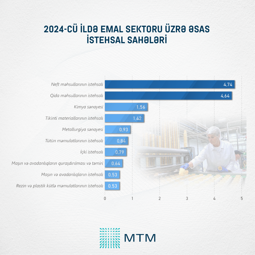 Emal sektoru üzrə istehsal həcminə görə ilk sıranı neft məhsullarının istehsalı tutur. 2024-cü il ərzində neft məhsullarının istehsalı 4,74 milyard manat təşkil edib. İkinci sıranı 4,64 milyard manatlıq istehsal ilə qida məhsulları tutur. Üçlüyü 1,56 milyard manat dəyərində istehsal həcmi ilə kimya sənayesi qapayır.