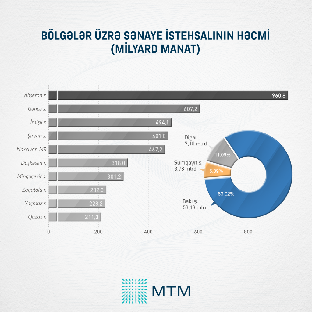 Bölgələr üzrə bölgüyə baxsaq, sənaye istehsalının əsas hissəsinin – 83,02%-nin və ya 53,18 milyard manatının paytaxtda qeydə alındığını görərik. Buna səbəb neft və qaz hasilatının əsasən Bakı ərazisində həyata keçirilməsidir. 2024-cü il ərzində sənaye şəhəri sayılan Sumqayıtda 3,78 milyard manat həcmində istehsal qeydə alınıb. Bu, istehsal həcmi milyardlarla ölçülən ikinci və sonuncu bölgəmizdir. Qalan bölgələr isə ümumilikdə sənaye istehsalının 11,08%-ni təşkil edib. Bu da 7,1 milyard manata bərabərdir. Buraya daxil olan hər bölgə üzrə sənaye istehsalının həcmi 1 milyard manatdan az olub.