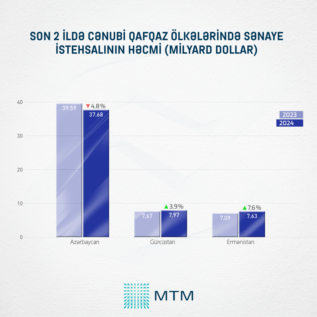 Cənubi Qafqaz ölkələrinin Dövlət Statistika Komitələrinin rəsmi məlumatlarına əsasən, Azərbaycanın sənaye istehsalı həcmi digər Cənubi Qafqaz ölkələri ilə müqayisə edilməyəcək qədər çoxdur. 2024-cü ildə Azərbaycanda sənaye istehsalı həcmi 2023-cü il ilə müqayisədə 4,8% və ya 1,90 milyard dollar azalsa da, həmin nəticə həm Gürcüstanın, həm də Ermənistanın göstəricisindən 4,9 dəfə artıqdır.