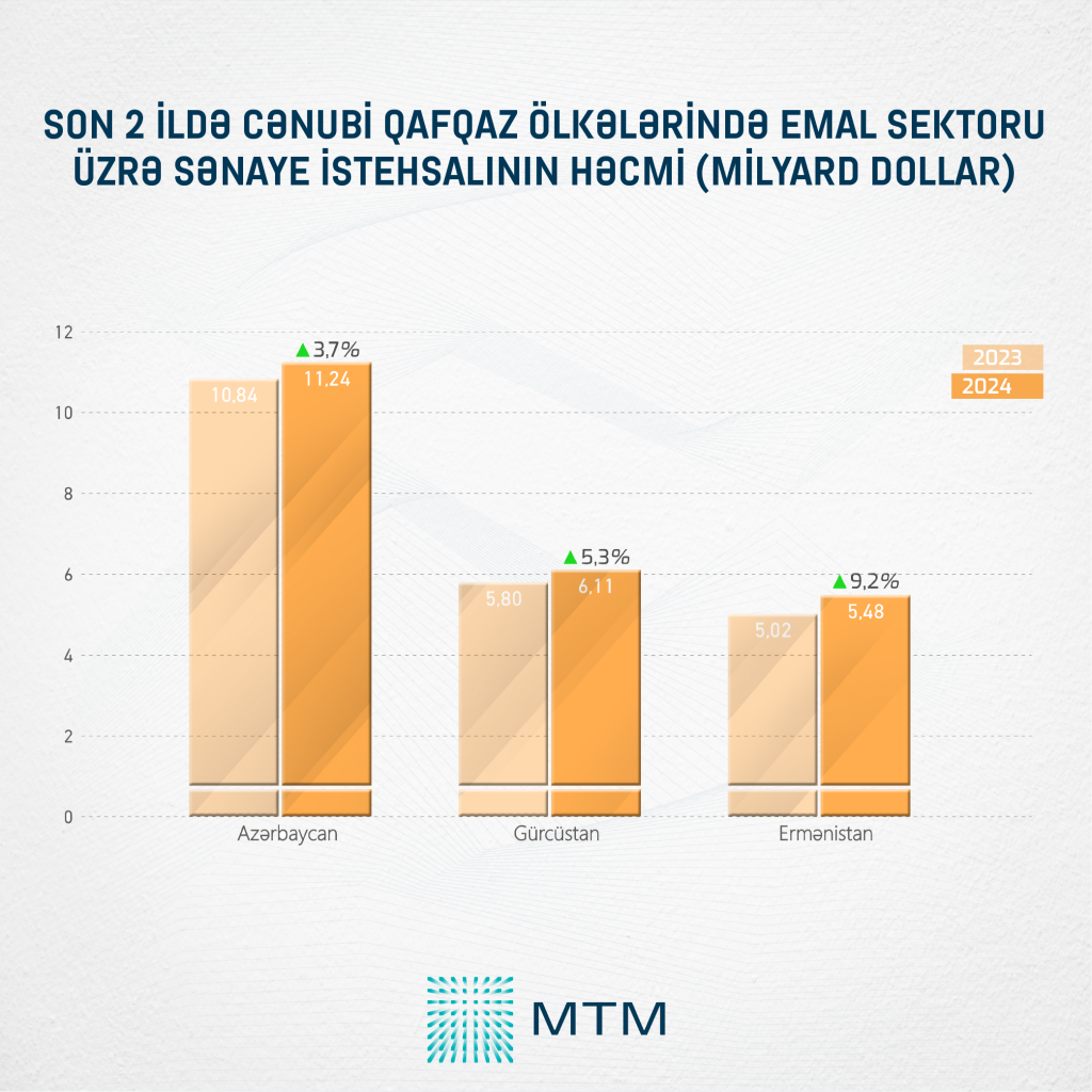 Azərbaycanın sənaye istehsalında xam neft və təbii qaz hasilatının böyük rol oynadığını nəzərə alaraq yalnız emal sektoru üzrə sənaye istehsalını Cənubi Qafqaz ölkələri ilə müqayisə etsək, yenə də Azərbaycanın böyük fərqlə lider olduğunu görərik. Belə ki, Azərbaycanda emal sənayesi üzrə sənaye istehsalı əvvəlki ilə nisbətən 3,7% və ya 0,4 milyard dollar artaraq 11,24 milyard dollara çatıb. Gürcüstanda isə bu göstərici 5,3% və ya 0,31 milyard dollar artaraq 6,11 milyard dollar olub. Həmçinin Ermənistanda emal sektoru üzrə istehsal həcmi 9,2% və ya 0,46 milyard dollar artaraq 5,48 milyard dollara çatıb.