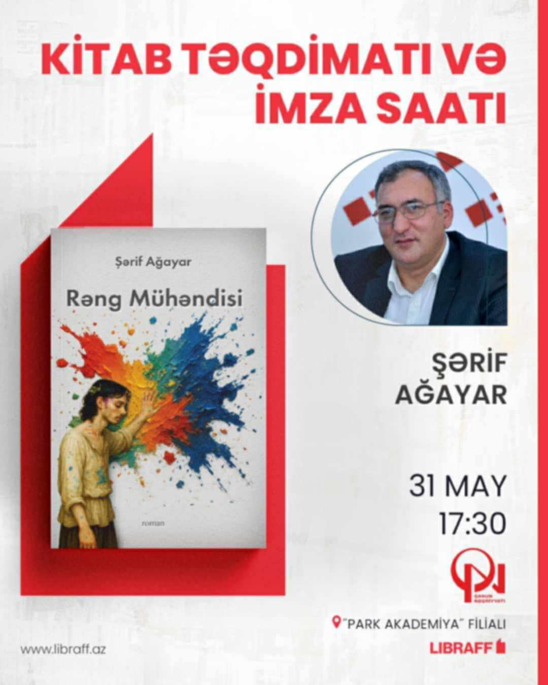 Mayın 31-i saat 17:30-da “Libraf” Kitab Mağazasının “Park Akademiya” filialında yazıçı Şərif Ağayarın yeni çapdan çıxmış “Rəng mühəndisi” romanının təqdimatı və imza saatı keçiriləcək.