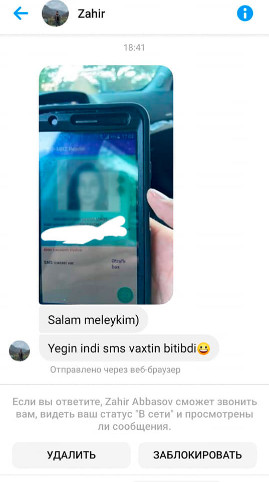 Onun sözlərinə görə, Koroğlu metrosundakı keçiddən çıxarkən Zahir Abbasov adlı polis əməkdaşı onun şəxsiyyət vəsiqəsinə baxdıqdan sonra məlumatlarını yaddaşda saxlayıb: “Daha sonra həmin şəxs mənə messenger vasitəsilə mesaj yazıb. 2-3 metr aralıda yenə bir polis məni yoxladı. Halbuki həmin şəxs gördü ki, artıq mən yoxlamadan keçmişəm. Bu, ancaq cavan qadınların başına gəlir. Belə çıxır ki, həmin şəxslər vəzifələrindən sui-istifadə edirlər. Mən vətəndaş olaraq nazirlik işçiləri tərəfindən sosial şəbəkədə bu cür narahat edilmək istəmirəm”.