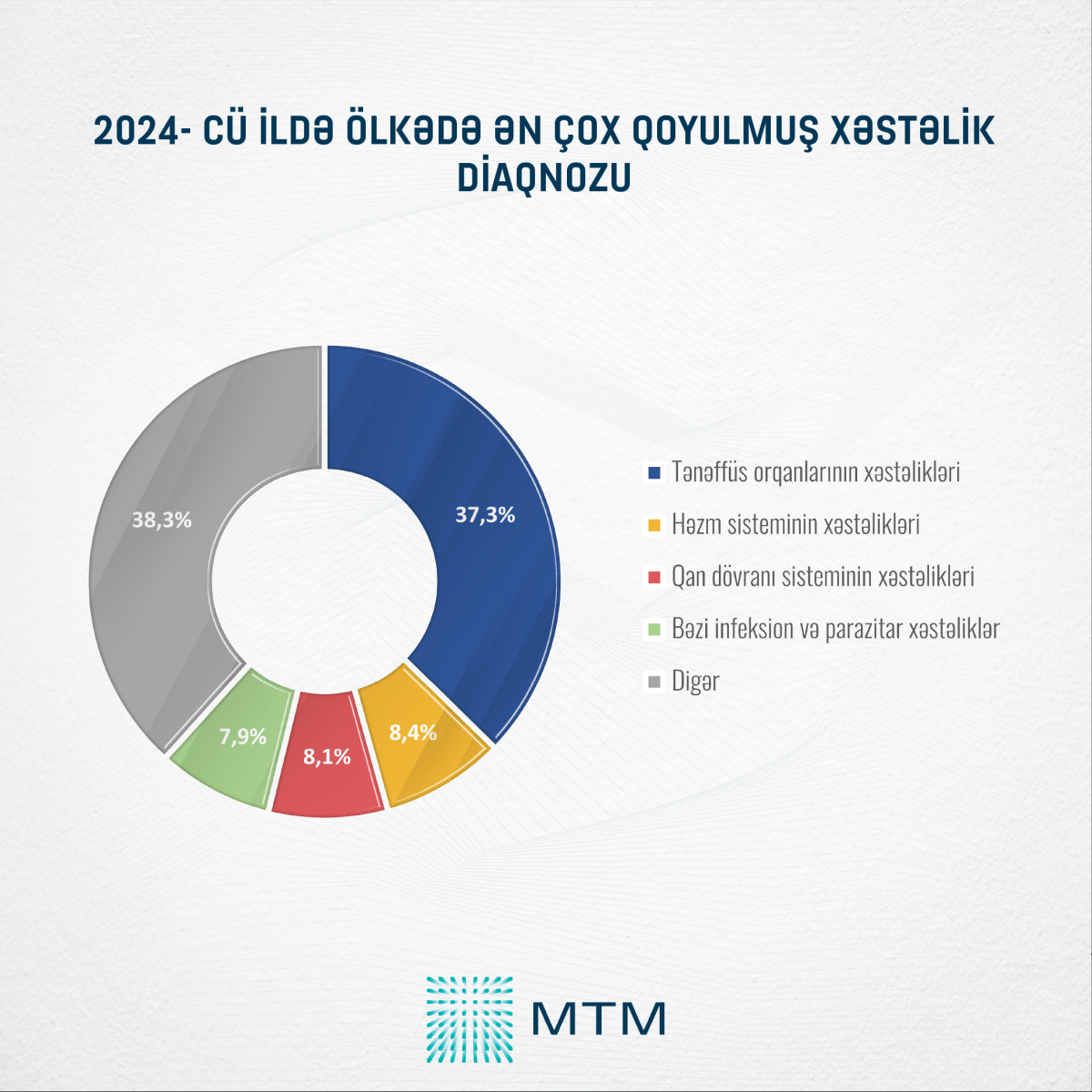 2024-cü ildə ölkədə qoyulan xəstəlik diaqnozları arasında “tənəffüs orqanlarının xəstəlikləri” (37,3%) xüsusi üstünlük təşkil edib. Bu göstərici, digər əsas xəstəlik qruplarından, yəni “həzm sistemi xəstəlikləri” (8,4%) və “qan dövranı sistemi xəstəlikləri”ndən (8,1%) dəfələrlə yüksək olub. Hər üç xəstəlik qrupu birlikdə ümumi diaqnozların təxminən 53,8%-ni təşkil etsə də, tənəffüs yolu xəstəliklərinin üstünlüyü, bu sahədə profilaktik tədbirlərin daha çox gücləndirilməsini zəruri edir.