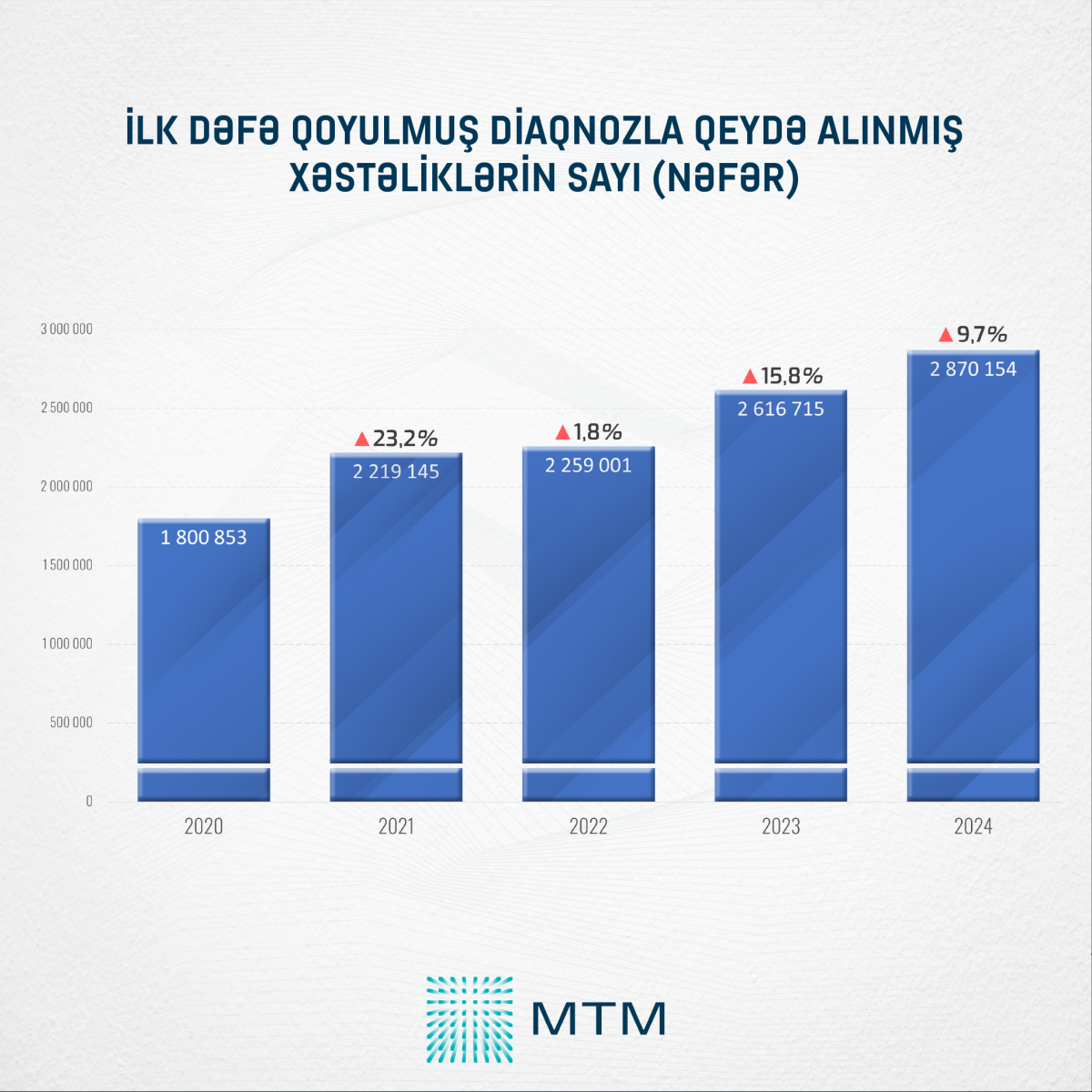 Media Təhlil Mərkəzinin (MTM) Dövlət Statistika Komitəsinin açıqladığı rəsmi rəqəmlər əsasında apardığı təhlilə görə, 2020-ci ildə “ilk dəfə qoyulmuş diaqnozla qeydə alınmış xəstələrin sayı” 1 800 853 nəfər idisə, 2024-cü ildə bu rəqəm 2 870 154 nəfərə çatıb.
