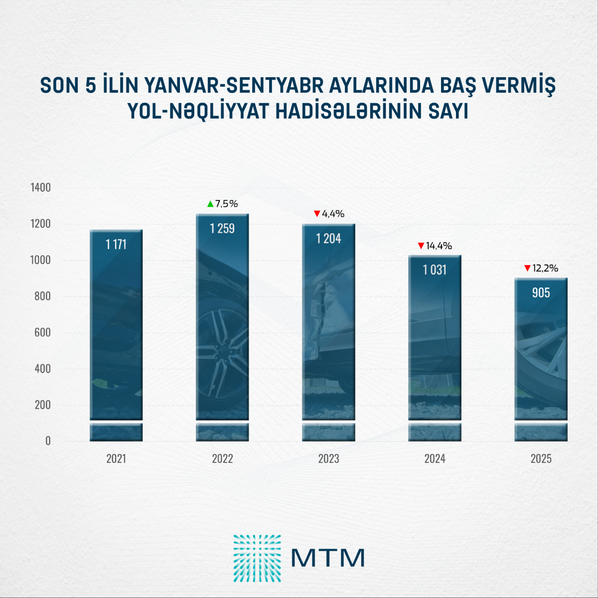 Media Təhlil Mərkəzinin (MTM) Dövlət Statistika Komitəsinin açıqladığı rəsmi rəqəmlər əsasında apardığı təhlilə görə, 2021-2025-ci illər üzrə yanvar–sentyabr aylarında yol-nəqliyyat hadisələrinin sayı ümumilikdə azalan dinamika nümayiş etdirib.