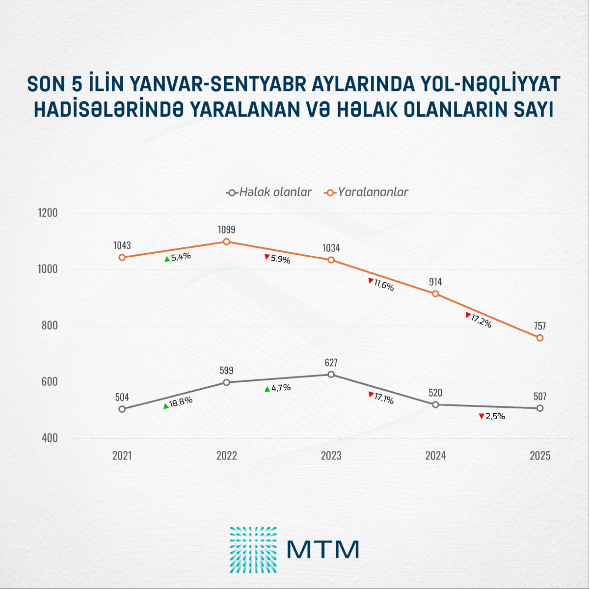 Həlak olanların dinamikası isə müəyyən fərqlər göstərir. 2021-ci ilin yanvar–sentyabr aylarında yol-nəqliyyat hadisələri nəticəsində 504 nəfər həlak olub. 2022-ci ildə bu göstərici 18,8% və ya 95 nəfər artaraq 599 nəfərə, 2023-cü ildə isə əlavə 4,7% və ya 28 nəfər artımla 627 nəfərə yüksəlib. Növbəti illərdə azalma qeydə alınıb: 2024-cü ilin yanvar–sentyabr aylarında həlak olanların sayı 17,1% və ya 107 nəfər azalaraq 520 nəfərə düşüb. 2025-ci ilin müvafiq dövründə isə bu göstərici 507 nəfər təşkil edib ki, bu da əvvəlki illə müqayisədə 2,5% və ya 13 nəfər azalma deməkdir.