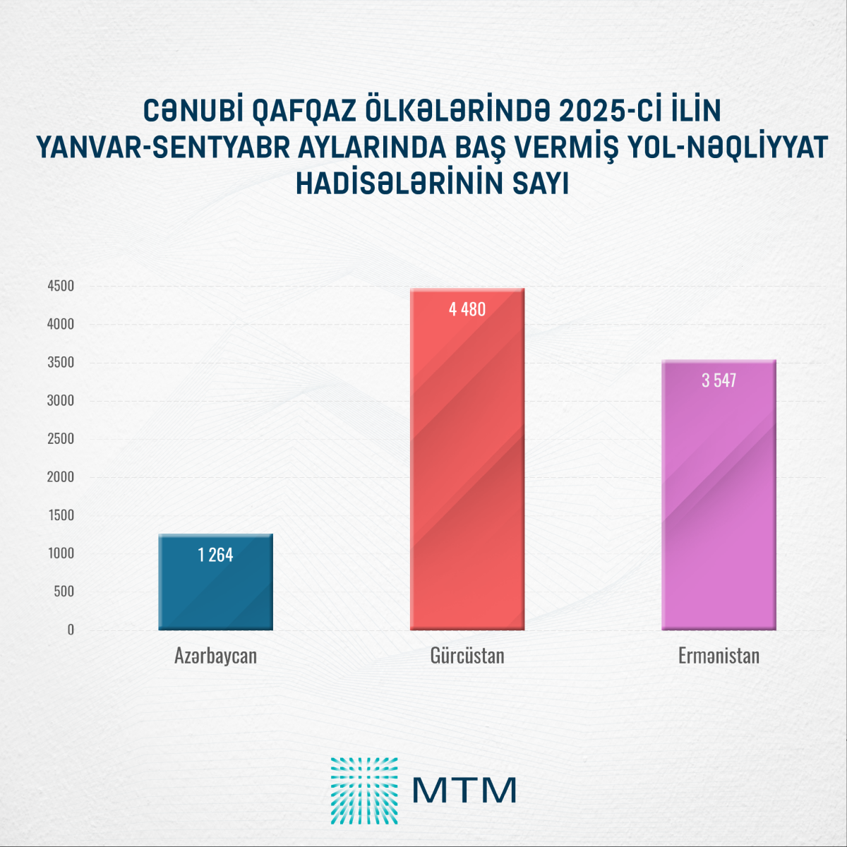 Hər üç ölkənin Dövlət Statistika Komitələrinin rəsmi internet resurslarında yayımlanan məlumatlara əsasən, 2025-ci ilin yanvar–sentyabr aylarına dair göstəricilərin müqayisəsi Cənubi Qafqaz ölkələri arasında yol-nəqliyyat hadisələrinin sayında ciddi fərqlərin mövcud olduğunu göstərir. Hesabat dövründə Azərbaycanda 1 264 yol-nəqliyyat hadisəsi qeydə alındığı halda, Gürcüstanda bu göstərici 4 480, Ermənistanda isə 3 547 olub.