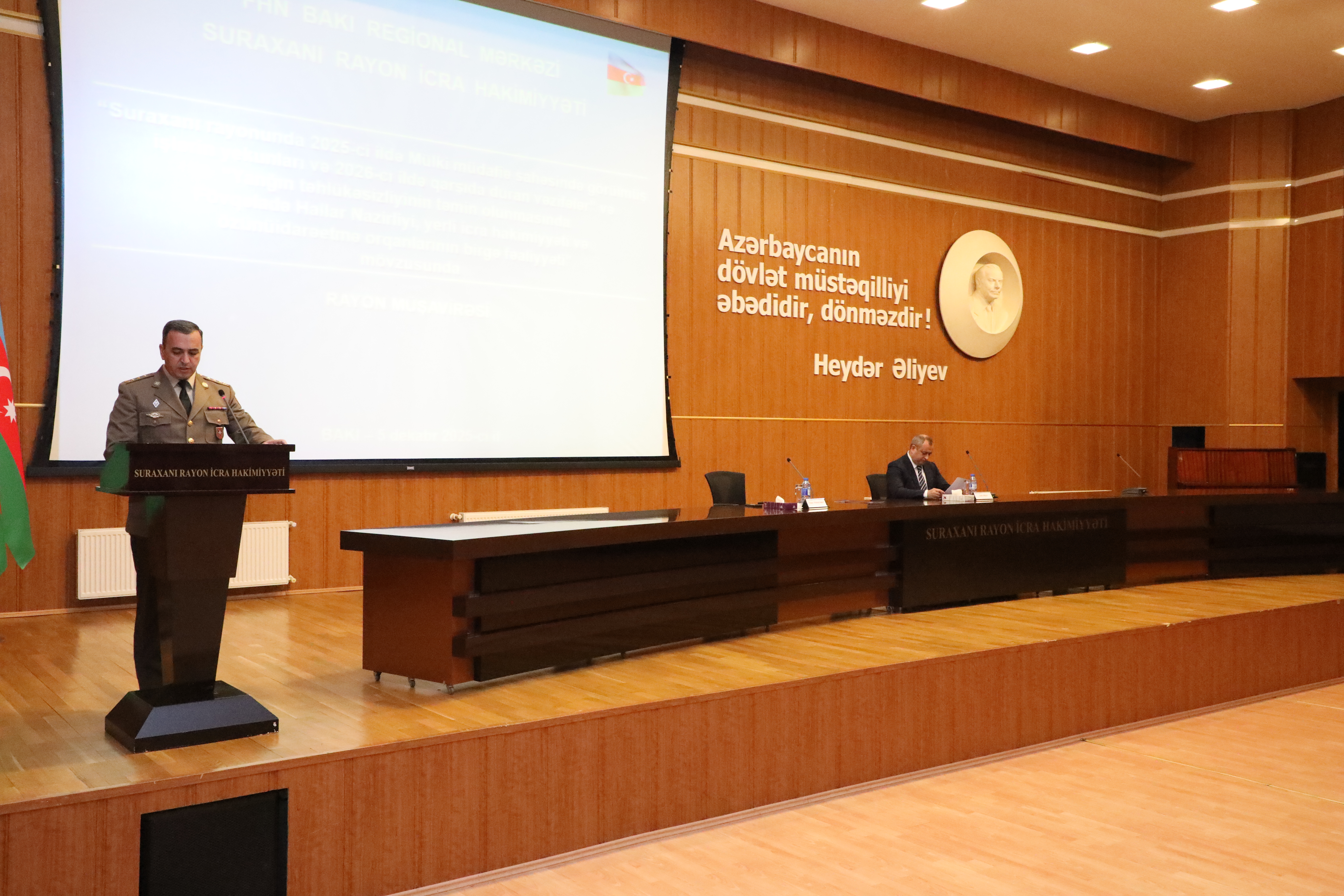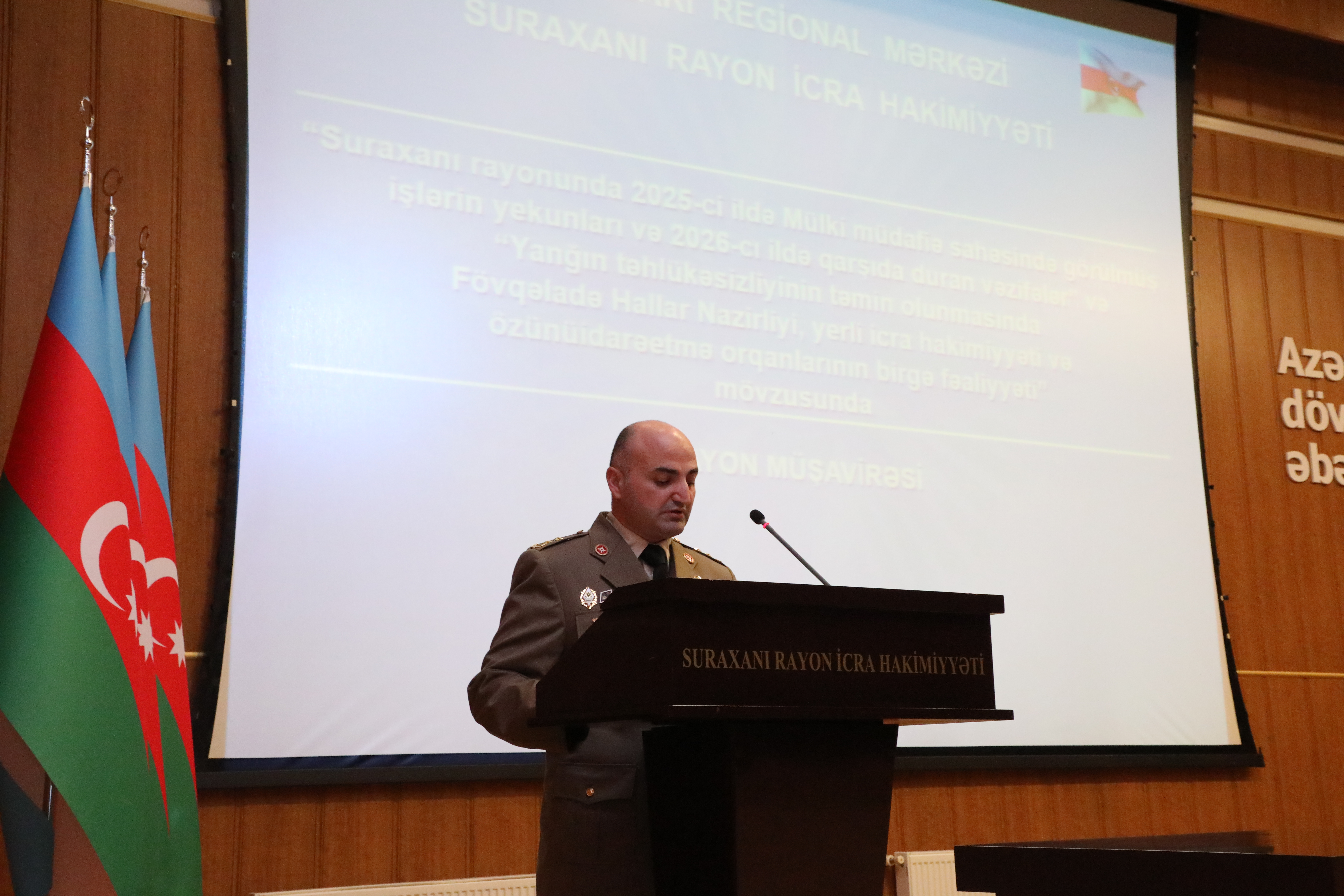 “Suraxanı rayonunda 2025-ci ildə Mülki müdafiə sahəsində görülmüş işlərin yekunları və 2026-cı ildə qarşıda duran məsələlər” və “Yanğın təhlükəsizliyinin təmin olunmasında Fövqəladə Hallar Nazirliyi, yerli icra hakimiyyəti və özünüidarəetmə orqanlarının birgə fəaliyyəti” mövzusunda rayon müşavirəsi keçirilib.