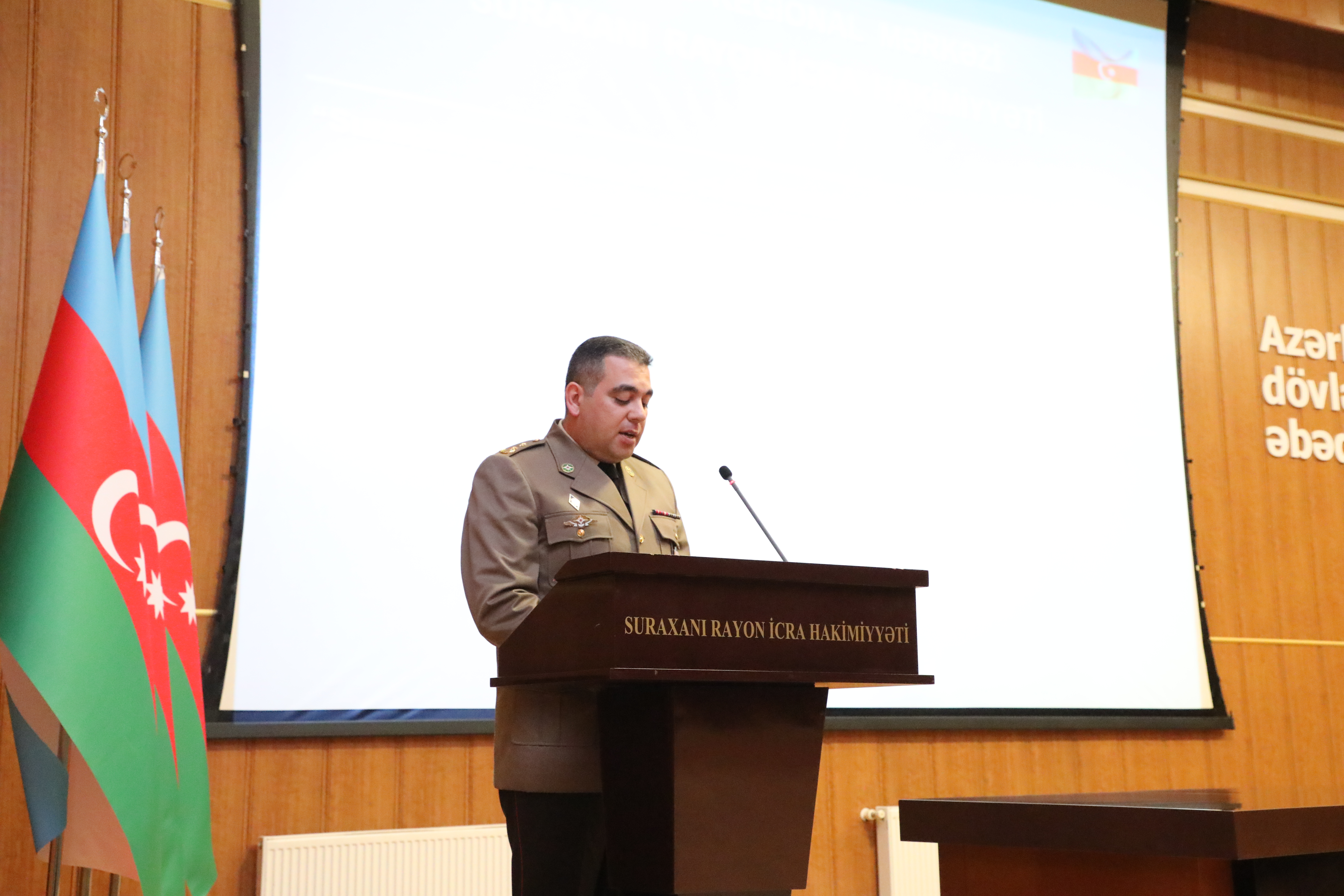 Suraxanı rayonu üzrə fövqəladə hallar və Mülki müdafiə şöbəsinin rəisi, polkovnik-leytenant Toğrul Vəliyev “rayon üzrə Mülki müdafiənin vəziyyəti”, 4-cü ərazi Dövlət Yanğın Nəzarəti İdarəsinin rəis müavini, daxili xidmət polkovnik-leytenantı Ramil Haqverdiyev “Yaşayış massivlərində yanğınların baş vermə səbəbləri: potensial təhlükələr və onların aradan qaldırılma yolları”, Suraxanı rayon Dövlət Yanğından Mühafizə Hissəsinin 28 nomrəli Yangindan Muhafizə Bolmesinin rəisi, daxili xidmət mayoru Vahid Huseynov “Yanğınların söndürülməsi prosesində qarşıya çıxan problemlər və onların həlli yolları”, Rayon Mənzil-Kommunal Təsərrüfatı Bitliyinin rəisi Mais Məmmədov “Yanğın təhlükəsizliyi və mülki müdafiənin təşkili ilə bağlı görülən işlər və mövcud problemlər”, Rayon Enerji təchizatı və Satışı İdarəsinin İstismar Şöbəsinin baş mühəndisi Xəyal Seyfəddinov “Rayonda enerji təchizatının mövcud vəziyyəti, problemlər və həlli yolları”, Bakı Regional Qaz İstismarı Departamentinin Suraxanı rayonu Qəza Bərpa Xidmətinin rəisi Vasif Kəlbiyev “Rayonda qaz təchizatının mövcud vəziyyəti, problemlər və həlli yolları”, Rayon Polis İdarəsi İctimai Təhlükəsizlik şöbəsinin baş inspektoru, polis kapitanı Tural Hacızadə “Baş vermiş fövqəladə hadisələr zamanı ictimai asayişin təşkili”, Suraxanı Təcili Təxirəsalınmaz Tibbi Yardım Stansiyası bölməsinin böyük həkimi Kəmalə Tağıyeva isə “Yanğın zamanı ilkin tibbi yardım” mövzularında çıxış ediblər.
