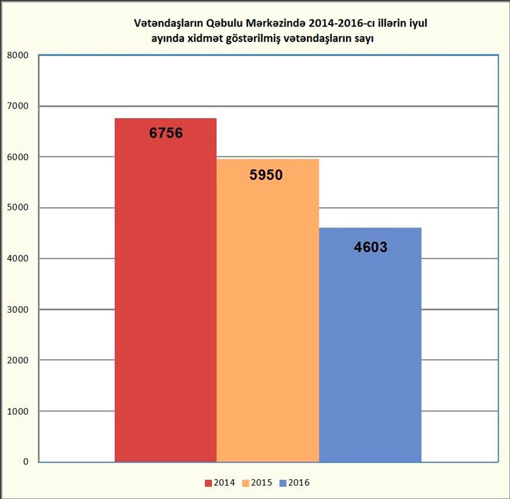 Vətəndaşların Qəbulu Mərkəzində isə bu dövrdə 4 603 vətəndaşa xidmət göstərilib.Telefon Məlumat Mərkəzinə və Vətəndaşların Qəbulu Mərkəzinə daxil olmuş müraciətlərin (əsasən sorğu xarakterli olub) əksəriyyəti dərhal cavablandırılıb və operativ həll olunub. Vətəndaşların Qəbulu Mərkəzində 1 461 sənəd (606 məktub, 526 ərizə, 329 digər sənəd) qəbul olunub və qeydiyyata alınıb.