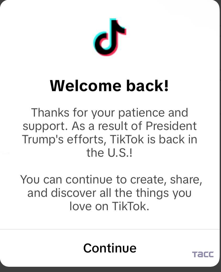 “Yenidən xoş gəlmisiniz. Səbriniz və dəstəyiniz üçün təşəkkür edirik. Prezident Trampın səyləri nəticəsində “TikTok” ABŞ-yə qayıdıb”, - tətbiqə daxil olarkən bildirişdə qeyd olunub.