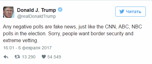 “Bütün neqativ sorğular CNN, ABC, NBC-nin seçkiqabağı apardığı sorğular kimi saxtadır. Üzr istəyirəm, amma xalq sərhəddə təhlükəsizliyini istəyir”, - deyə Tramp yazıb.