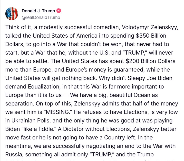 Qeyd edək ki, Tramp bir neçə gün öncə özünün sahibi olduğu “Truth” sosial şəbəkəsində Zelenski barədə “diktator” ifadəsini işlədib və qeyd edib ki, o, ölkəsində seçkilərin keçirilməsini istəmir. Jurnalistin sualını təkzib etsə də, həmin paylaşım Trampın sosial şəbəkə hesabında hələ də qalmaqdadır.
