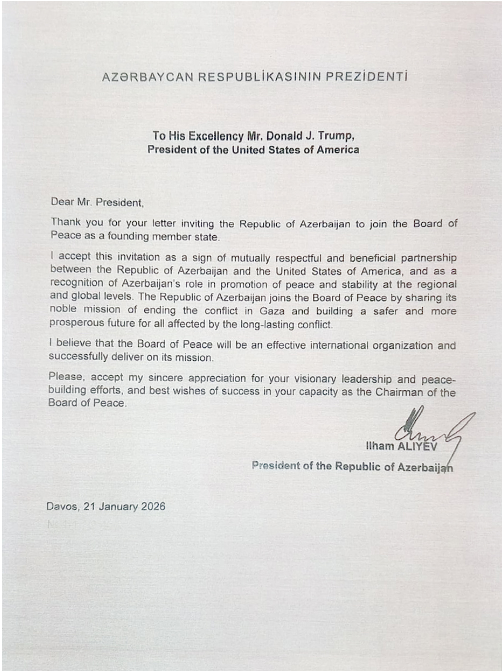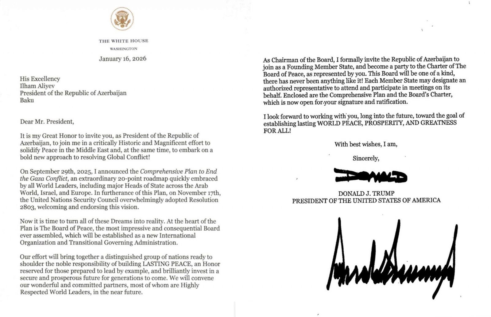 Şuranın Sədri kimi, Azərbaycan Respublikasını təsisçi üzv dövlət qismində qoşulmağa və Sizin təmsilçiliyinizlə Sülh Şurasının Nizamnaməsinə tərəf olmağa rəsmi şəkildə dəvət edirəm. Bu Şura bənzərsiz bir qurum olacaq - indiyədək buna oxşar heç bir qurum mövcud olmayıb! Hər bir üzv dövlət onun adından iclaslarda iştirak etmək və təmsil olunmaq üçün səlahiyyətli nümayəndə təyin edə bilər. Əlavədə əhatəli plan və hazırda imzalanma və ratifikasiya üçün açıq olan Şuranın Nizamnaməsi təqdim olunur.