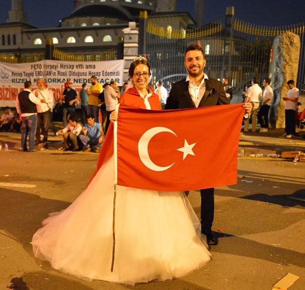 Yeni evlənən cütlük toy libasında, əllərində bayraq “Demokratiya keşiyində” dayanmaq üçün izdihama qarışıb.