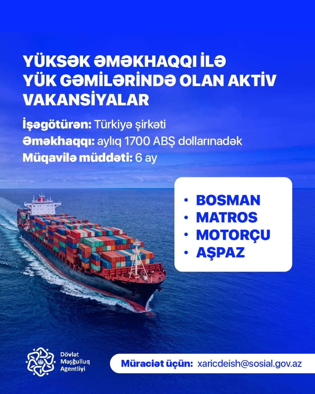 - Gəmiçilik sahəsi üzrə (fərqli tonnajlı quru yük gəmilərində) hər birində əməkhaqqı 1700 ABŞ dollarına qədər və müqavilə müddəti 6 ay olan 20-dən çox vakansiya (bosman, matros, motorçu, aşpaz).