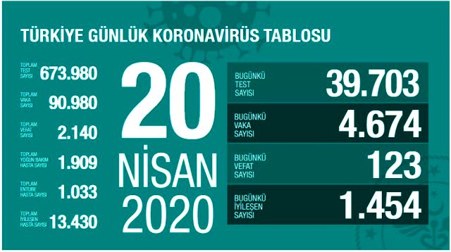 Türkiyədə koronavirusdan ölənlərin sayı daha 123 nəfər artaraq 2140-a yüksəlib.