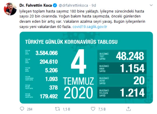 Türkiyədə son 24 saatda 20 nəfər dünyasını dəyişib, 1154 nəfərdə Covid-19 aşkarlanıb.