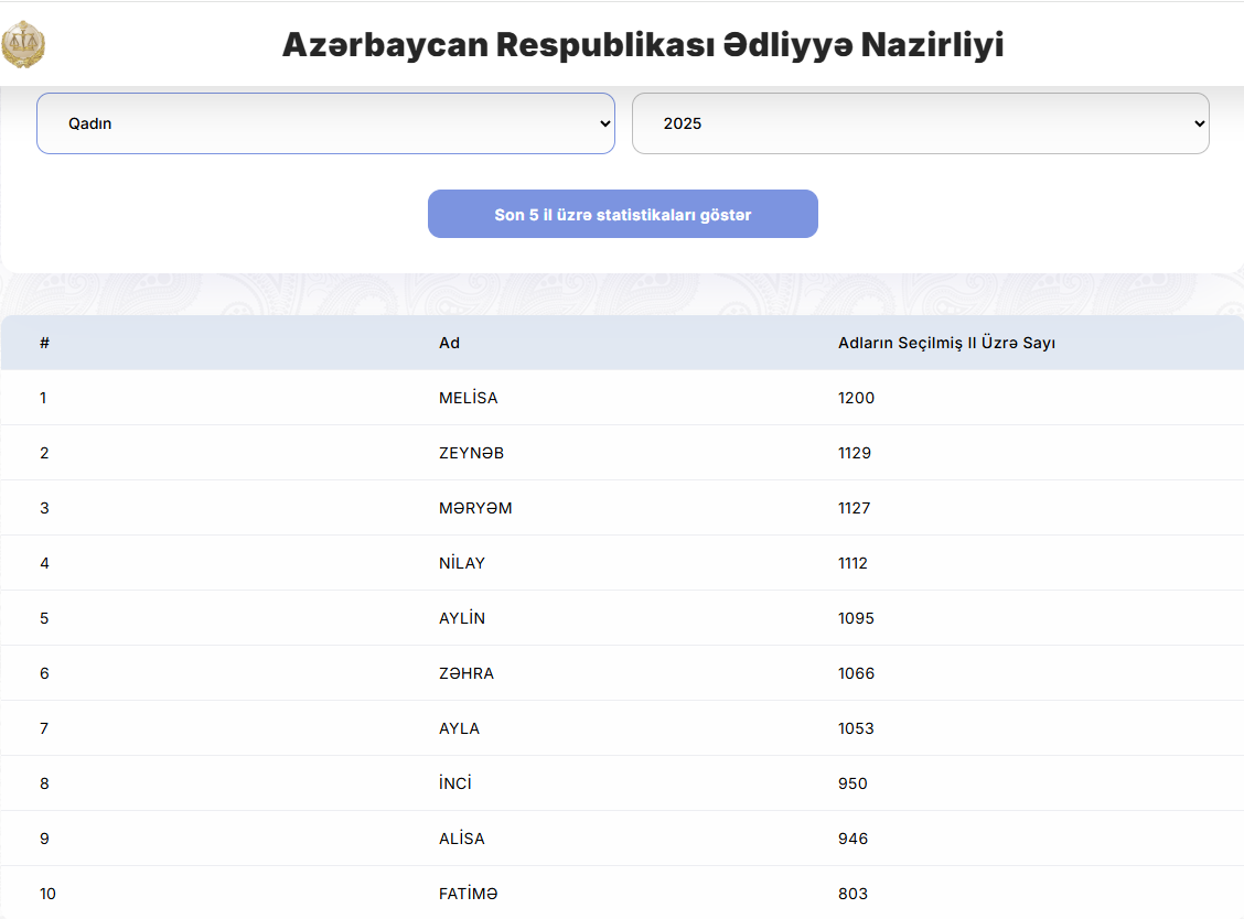 Son 5 il üzrə adların siyahısında isə Uğur və Zəhra ilk sıradadır.