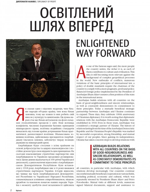 Ukraynanın tanınmış “Diplomat” jurnalında Azərtac-ın Ukrayna, Belarus, Moldova üzrə xüsusi müxbiri Emil Hüseynlinin Azərbaycan Prezidenti İlham Əliyevin uğurlu xarici siyasətinə həsr olunan “İşıqlı gələcəyə aparan yol” sərlövhəli məqaləsi dərc edilib.