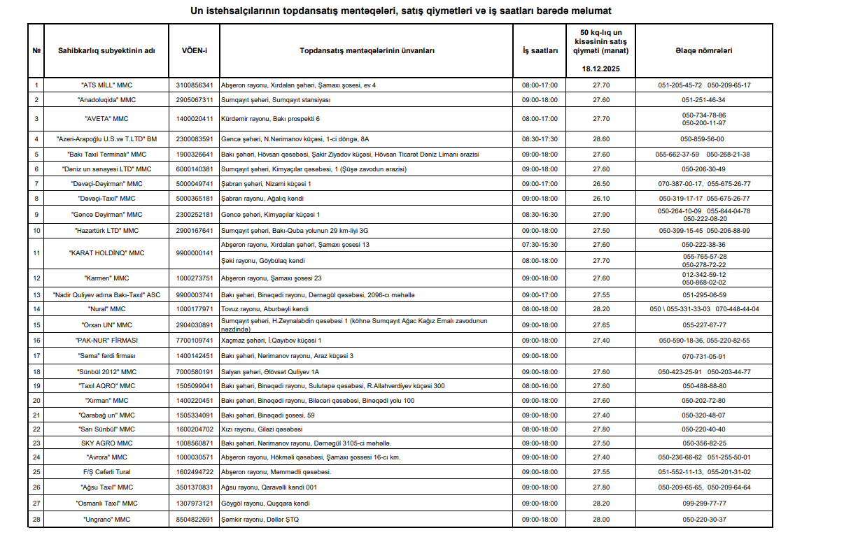 Belə ki, 50 kiloqramlıq un kisəsinin topdansatış qiymətləri 26,10 manat - 28,60 manat aralığında dəyişir.