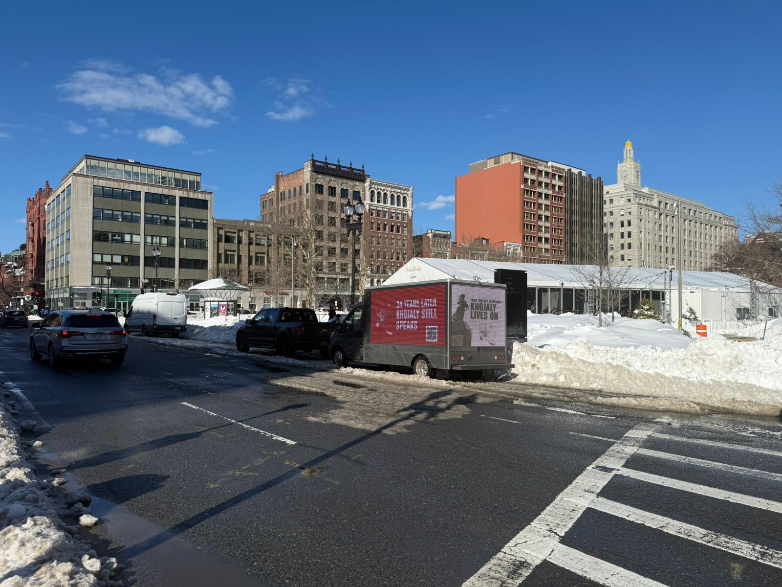 LED ekranlı maşınlarda Boston Şəhər İdarəsinin və Massaçusetts ştatının Qubernator Evinin qarşısından keçərək Copley meydanında hərəkət edib. Xocalı ilə bağlı tarixi həqiqətləri geniş ictimaiyyətə çatdırmaq üçün avtomobillər şəhərin mərkəzi küçələri – Boylston, Tremont, Vaşinqton və Bikon istiqamətlərində də yürüş ediblər.