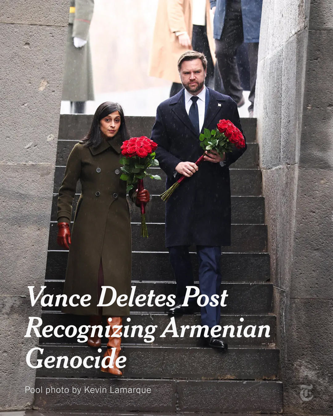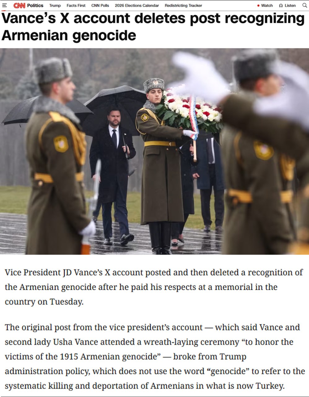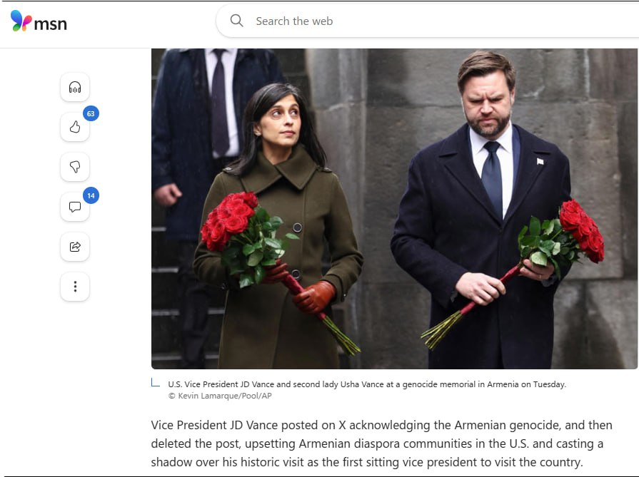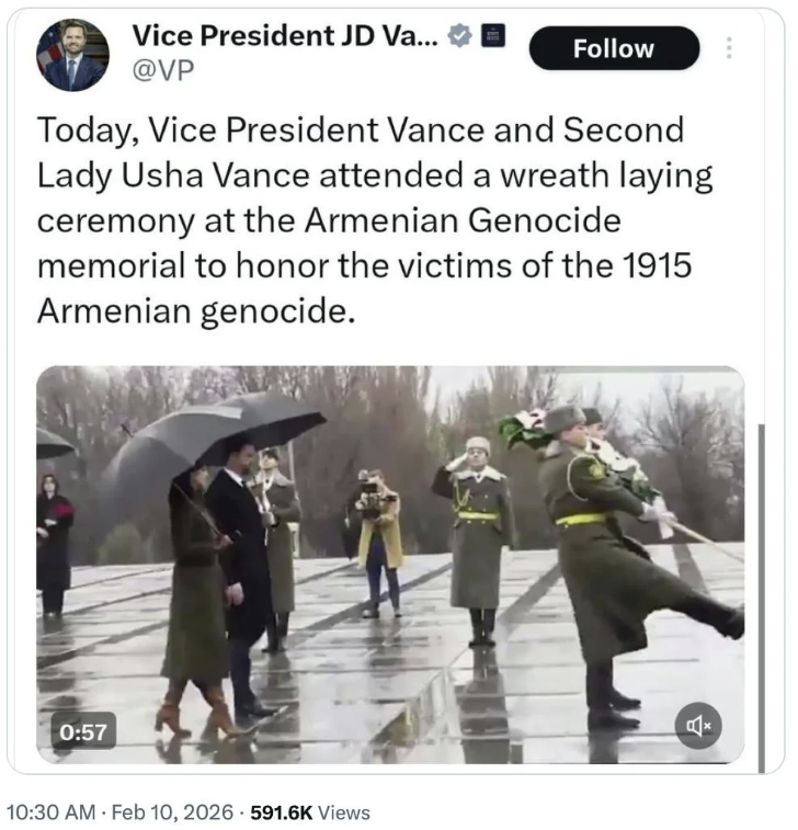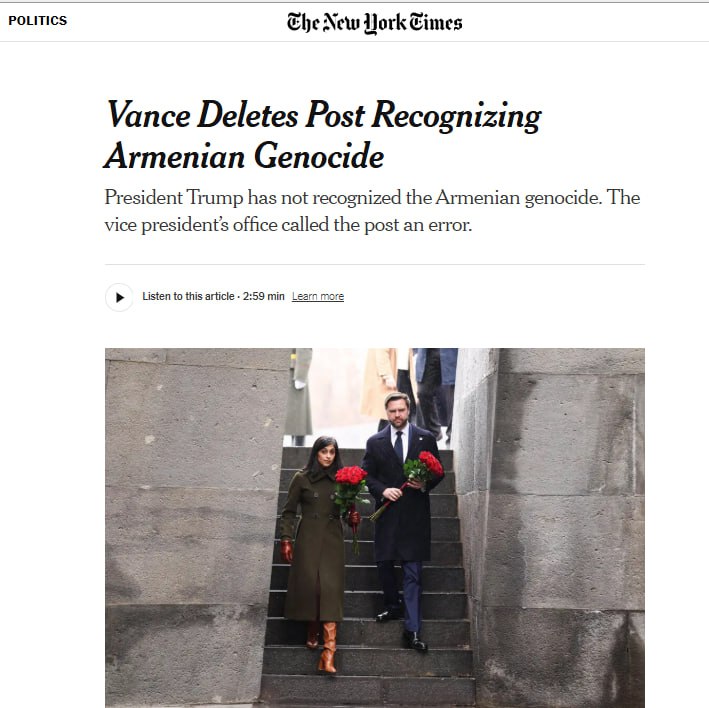 “Qafqazinfo” xəbər verir ki, C.D.Vensin Ermənistanın paytaxtı İrəvana səfəri çərçivəsində qondarma “erməni soyqırımı” abidəsini ziyarət edərək rəsmi “X” hesabında oradan görüntülər paylaşması və daha sonradan silməsi ciddi rezonansa səbəb olub.