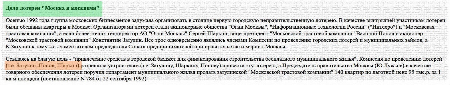 Lotereya 1992-ci ildə "Moskva İşıqları" ASC (Sergey Şarkin), Moskva Trust Şirkəti (Vitse-Prezident - Vasiliy Popov, təsisçilərdən biri - K.Zatulin) və "Rusiya İnformasiya Texnologiyaları" ASC (baş direktor - V. Popov, Zatulinin şirkətləri ilə eyni ünvanda Varvarka 11-də qeydiyyatdadır) tərəfindən təşkil edilir. K.Zatulin, V.Popov, S.Şarkinin daxil olduğu Şəhər Lotereyalarının və Bələdiyyə Kreditlərinin keçirilməsi üzrə Komissiya Bələdiyyə Mənzil Təsərrüfatı Departamentinə tapşırır ki, "... Moskva Trest Şirkətinə 95 min rubl dəyərində 140 mənzil satılsın”. Burada göstərilən qiymət simvolikdir: Moskvada 1 m2 hətta o zaman bir min dollara başa gəlirdi. Lotereyadan əldə edilən gəlirin 30 faizi təsisçilərə - yəni üç özəl firmaya ayrılmalı idi.