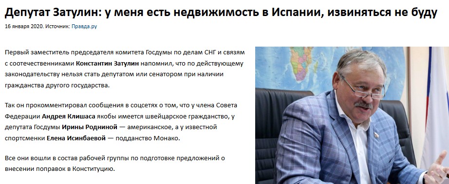 Aydın məsələdir ki, adi QHT əməkdaşı, deputat Zatulin üçün yüz minlərlə dollarlıq mənzillər şübhəli sövdələşmələrdir. Ola bilsin ki, o, Dövlət Dumasının deputatı kimi, xaricdəki daşınmaz əmlaklarının gizli qalmasına cəhd edib.