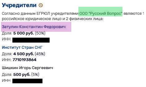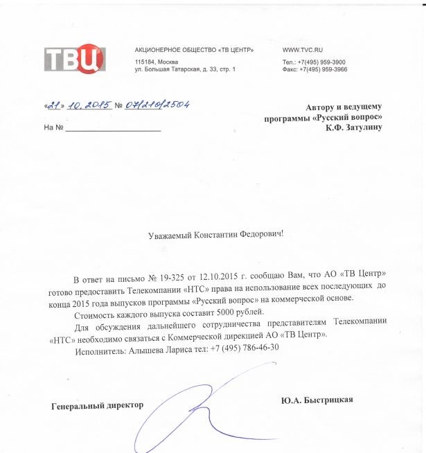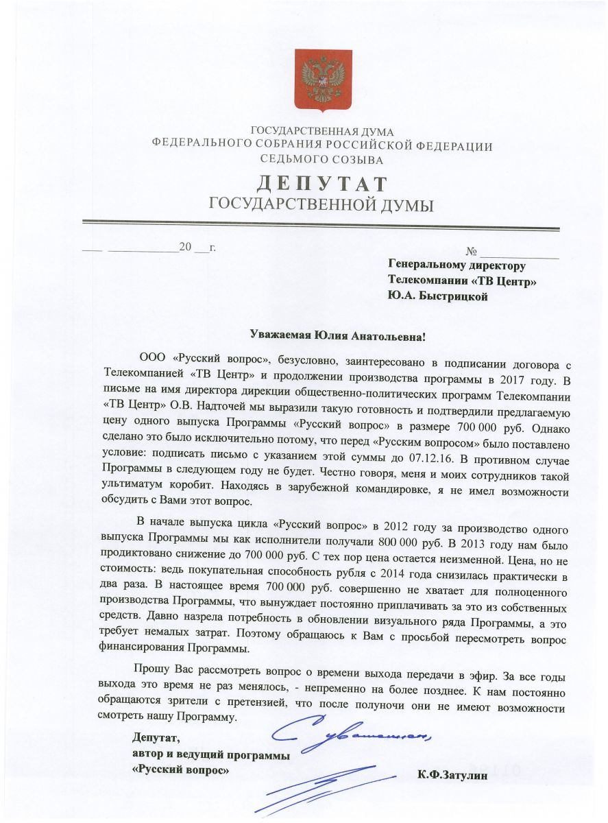Halbuki, rəsmi olaraq bu veriliş Zatulinin rəhbəri olduğu “Ruskiy Vopros” ASC-nin adından götürülüb və “ТВЦ” telekanalı ilə hər verilişə görə 700 min rublluq müqavilə də bağlayıb.